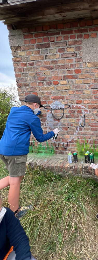 Leider musste der zweite Nachmittag ausfallen, da der starke Regen ☔️🌧️die Wand und das umliegende Gelände stark durchnässte. Unter diesen Bedingungen hätten wir die Farbe nicht zum Halten bringen können. Dennoch dürft ihr euch einen kleinen Eindruck vom ersten Teil der Arbeit verschaffen. Seid gespannt, wann sich die Künstler 👨🏼🎨 👩🏼🎨das nächste Mal treffen, um das Kunstwerk 🖌️🎨fertigzustellen und dieses wunderbare Projekt mit Freude abzuschließen.